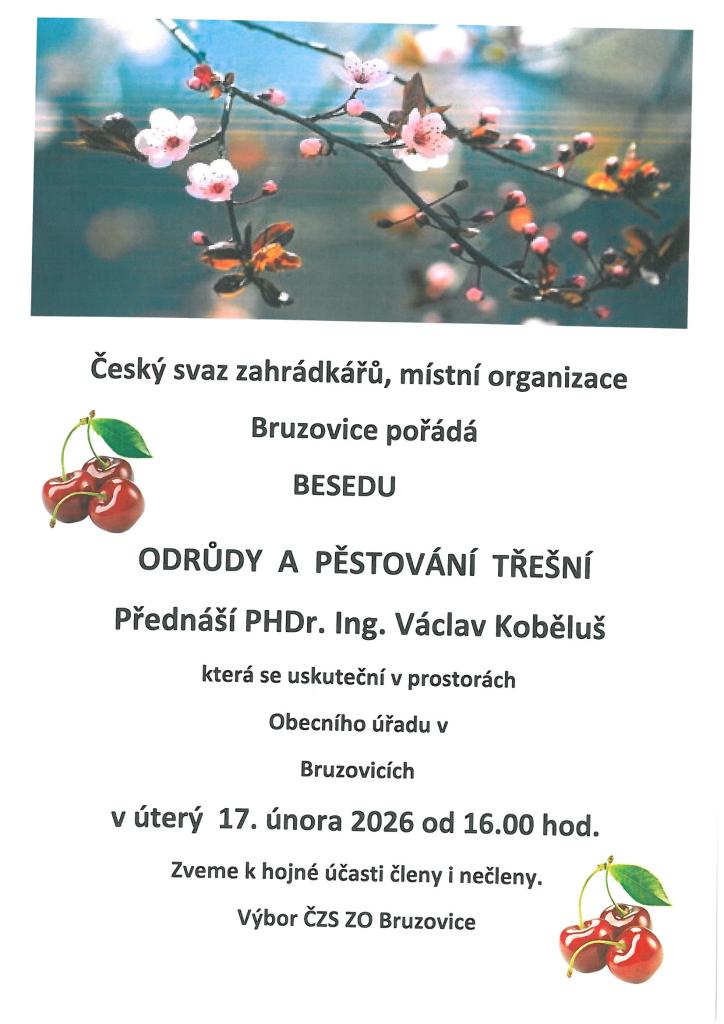 Český svaz zahrádkářů, místní organizace Bruzovice vás zve na BESEDU - ODRŮDY A PĚSTOVÁNÍ TŘEŠNÍ. Přednáší PHDr. Ing. Václav Koběluš