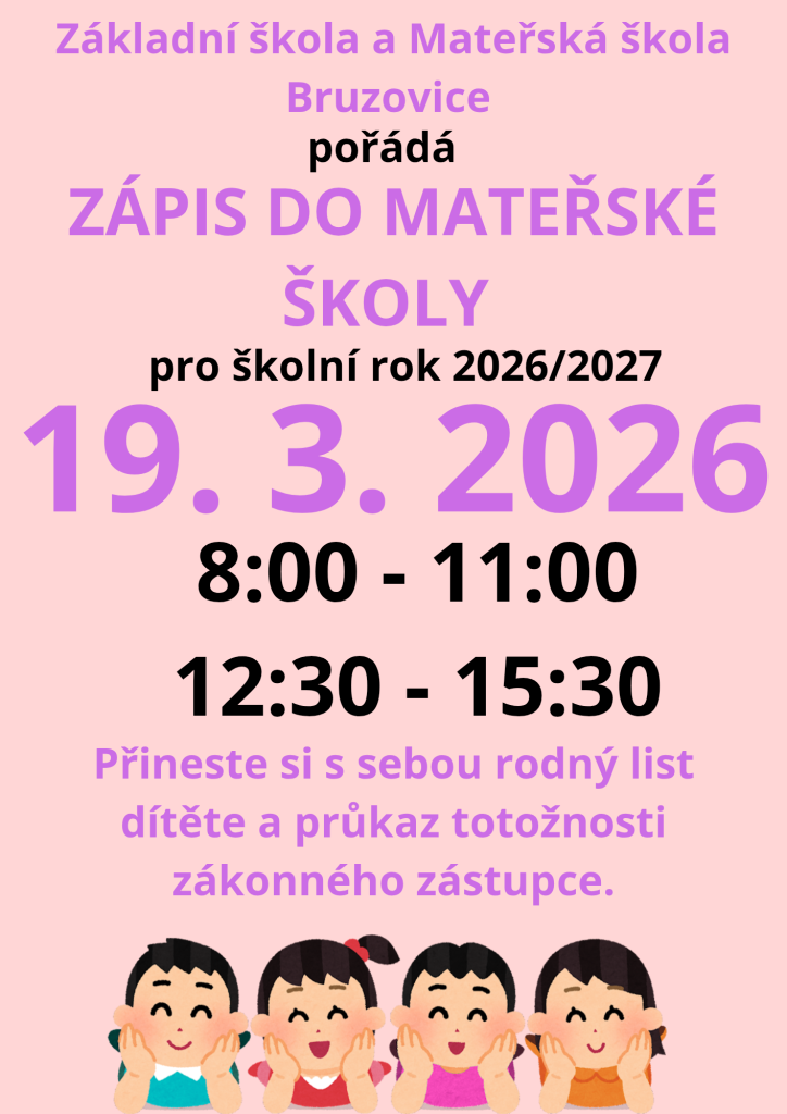 ZŠ a MŠ Bruzovice pořádá ZÁPIS DO MATEŘSKÉ ŠKOLY pro školní rok 2026/2027. Zápis se koná 19. 3. 2026 od 8:00 do 11:00 a od 12:30 do 15:30 hodin